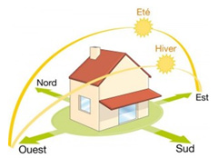 - L’orientation des fenêtres : elles doivent se trouver en priorité au sud ou l’ensoleillement est maximum afin d’augmenter les apports solaires naturels. Il faut à l’inverse limiter les ouvertures au Nord qui ont un bilan perte/apport négatif. Il est par ailleurs indispensable de protéger les fenêtres au Sud par l’utilisation de brise-soleils extérieurs, de casquettes solaires ou par la mise en place de végétation caduque afin de limiter les risques de surchauffe en été. Les ouvertures à l’Ouest, sont à éviter surtout dans le Sud de la France car le rayonnement du soleil d’été est difficile à arrêter et le risque de surchauffe est grand.