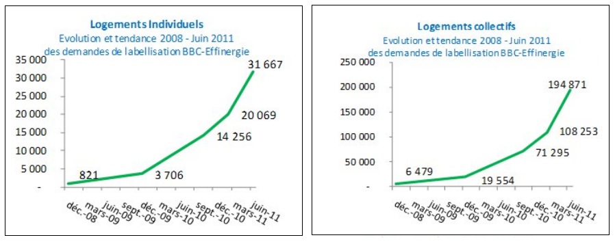 Depuis 2008, le nombre de labellisations pour des logements collectifs connait une augmentation considérable puisque les demandes estimées à 6 500 en décembre 2008 se rapprochaient en juillet 2011 des 200 000.